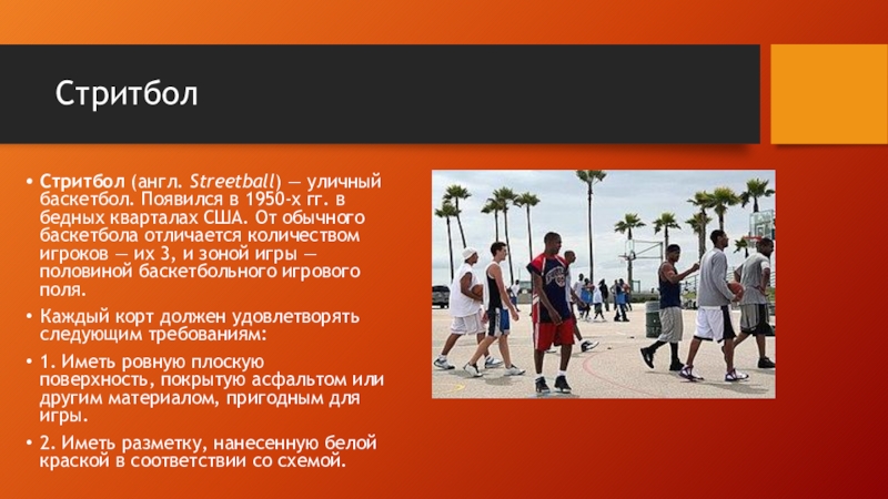 Стритбол (англ. Streetball) — уличный баскетбол. Появился в 1950-х гг. в бедных кварталах