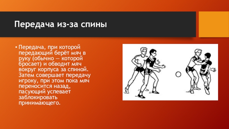 которой бросает) и обводит мяч вокруг корпуса за спиной. Затем совершает передачу игроку, при этом пока мяч переносится назад, пасующий успевает заблокировать принимающего.