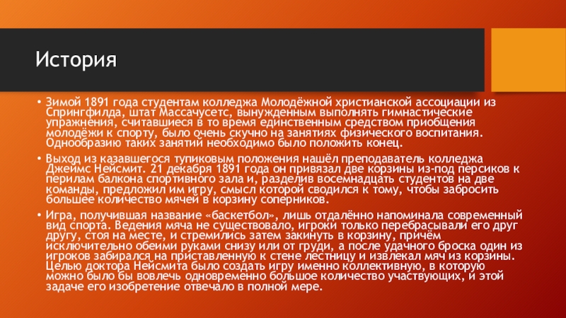 Зимой 1891 года студентам колледжа Молодёжной христианской ассоциации из Спрингфилда, штат