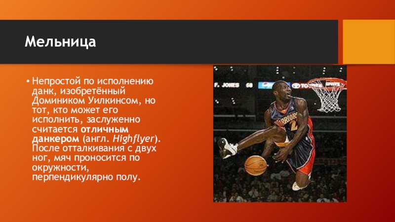 его исполнить, заслуженно считается отличным данкером (англ. Highflyer). После отталкивания с двух ног, мяч проносится по окружности, перпендикулярно полу.