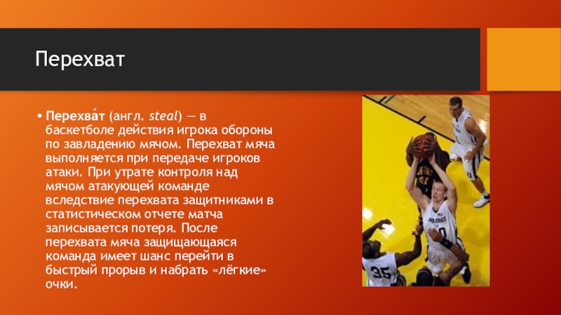 Перехва́т (англ. steal) — в баскетболе действия игрока обороны по завладению мячом. Перехват