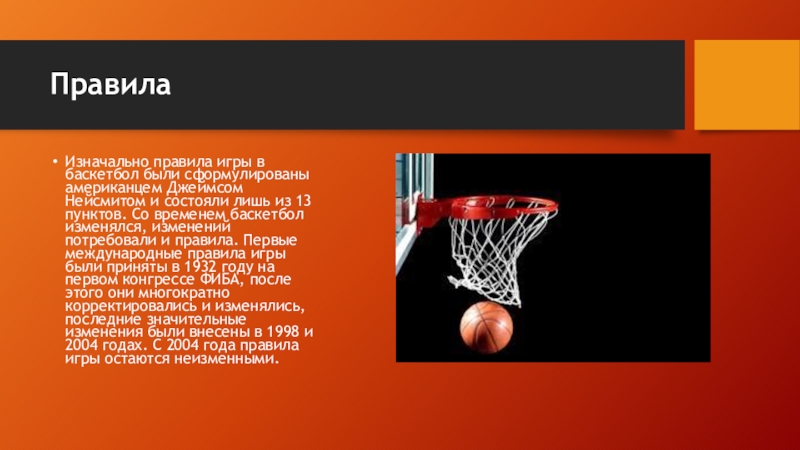 состояли лишь из 13 пунктов. Со временем баскетбол изменялся, изменений потребовали и правила. Первые международные правила игры были приняты в 1932 году на первом конгрессе ФИБА, после этого они многократно корректировались и изменялись, последние значительные изменения были внесены в 1998 и 2004 годах. С 2004 года правила игры остаются неизменными.