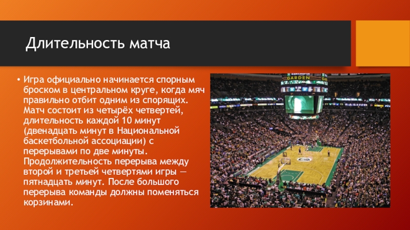правильно отбит одним из спорящих. Матч состоит из четырёх четвертей, длительность каждой 10 минут (двенадцать минут в Национальной баскетбольной ассоциации) с перерывами по две минуты. Продолжительность перерыва между второй и третьей четвертями игры — пятнадцать минут. После большого перерыва команды должны поменяться корзинами.