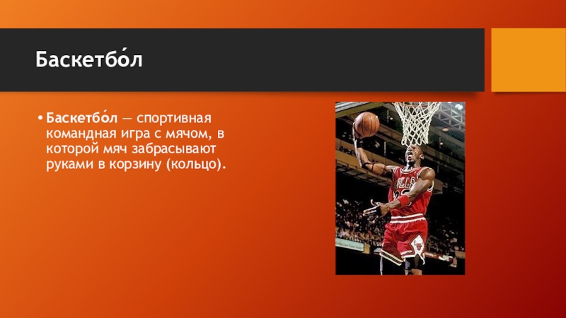 Баскетбо́л — спортивная командная игра с мячом, в которой мяч забрасывают руками