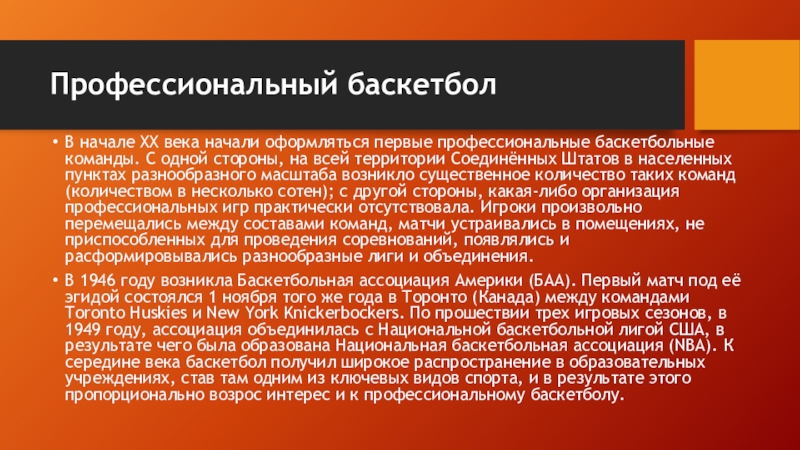 В 1946 году возникла Баскетбольная ассоциация Америки (БAA). Первый матч под её эгидой состоялся 1 ноября того же года в Торонто (Канада) между командами Toronto Huskies и New York Knickerbockers. По прошествии трех игровых сезонов, в 1949 году, ассоциация объединилась с Национальной баскетбольной лигой США, в результате чего была образована Национальная баскетбольная ассоциация (NBA). К середине века баскетбол получил широкое распространение в образовательных учреждениях, став там одним из ключевых видов спорта, и в результате этого пропорционально возрос интерес и к профессиональному баскетболу.