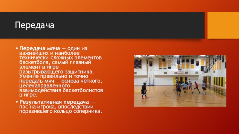 Передача мяча — один из важнейших и наиболее технически сложных элементов баскетбола,