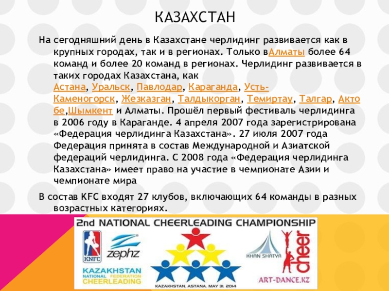 так и в регионах. Только вАлматы более 64 команд и более 20 команд в регионах. Черлидинг развивается в таких городах Казахстана, как Астана, Уральск, Павлодар, Караганда, Усть-Каменогорск, Жезказган, Талдыкорган, Темиртау, Талгар, Актобе,Шымкент и Алматы. Прошёл первый фестиваль черлидинга в 2006 году в Караганде. 4 апреля 2007 года зарегистрирована «Федерация черлидинга Казахстана». 27 июля 2007 года Федерация принята в состав Международной и Азиатской федераций черлидинга. С 2008 года «Федерация черлидинга Казахстана» имеет право на участие в чемпионате Азии и чемпионате мира