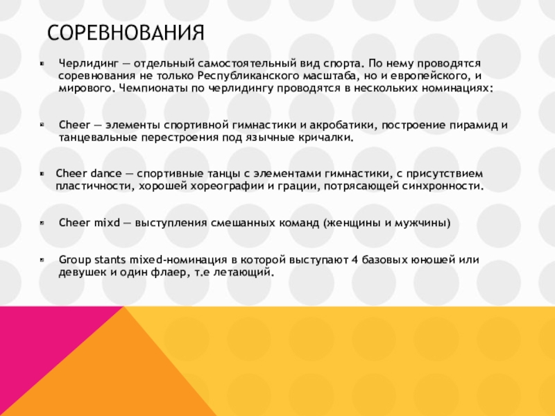 только Республиканского масштаба, но и европейского, и мирового. Чемпионаты по черлидингу проводятся в нескольких номинациях:
