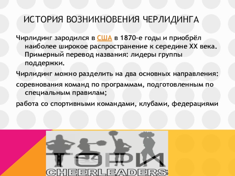 Чирлидинг зародился в США в 1870-е годы и приобрёл наиболее