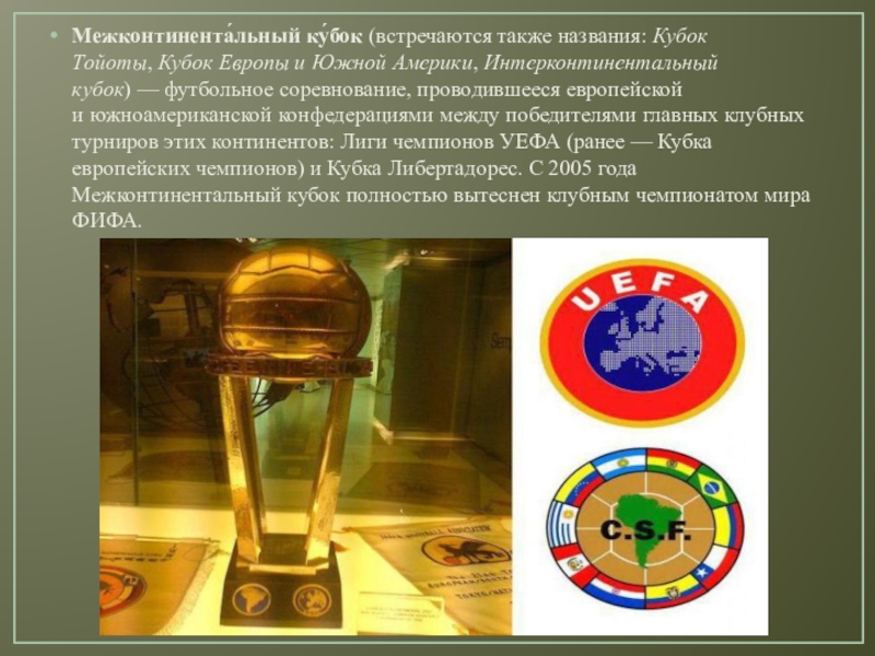 Слайд 11Межконтинента́льный ку́бок (встречаются также названия: Кубок Тойоты, Кубок Европы и Южной Америки, Интерконтинентальный кубок) — футбольное соревнование,