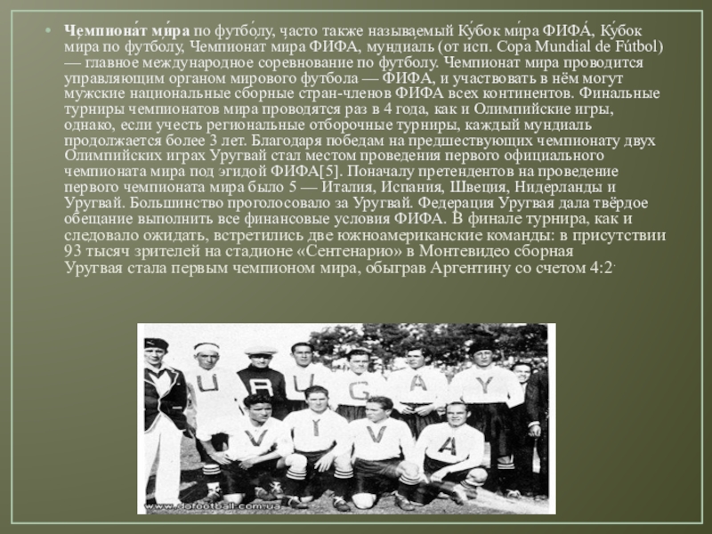 ми́ра по футбо́лу, Чемпиона́т ми́ра ФИФА, мундиа́ль (от исп. Copa Mundial de Fútbol) — главное международное соревнование по футболу. Чемпионат мира проводится управляющим органом мирового футбола — ФИФА, и участвовать в нём могут мужские национальные сборные стран-членов ФИФА всех континентов. Финальные турниры чемпионатов мира проводятся раз в 4 года, как и Олимпийские игры, однако, если учесть региональные отборочные турниры, каждый мундиаль продолжается более 3 лет. Благодаря победам на предшествующих чемпионату двух Олимпийских играх Уругвай стал местом проведения первого официального чемпионата мира под эгидой ФИФА[5]. Поначалу претендентов на проведение первого чемпионата мира было 5 — Италия, Испания, Швеция, Нидерланды и Уругвай. Большинство проголосовало за Уругвай. Федерация Уругвая дала твёрдое обещание выполнить все финансовые условия ФИФА. В финале турнира, как и следовало ожидать, встретились две южноамериканские команды: в присутствии 93 тысяч зрителей на стадионе «Сентенарио» в Монтевидео сборная Уругвая стала первым чемпионом мира, обыграв Аргентину со счетом 4:2.