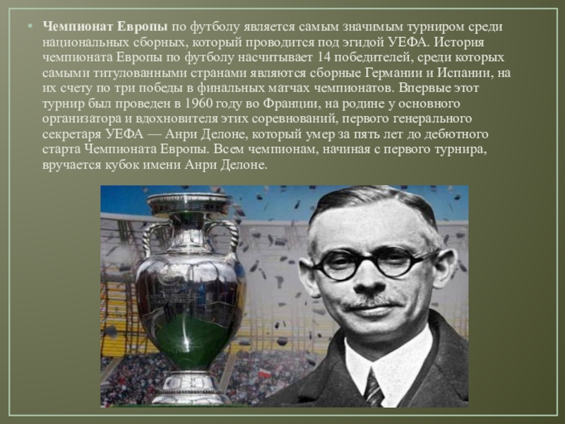 который проводится под эгидой УЕФА. История чемпионата Европы по футболу насчитывает 14 победителей, среди которых самыми титулованными странами являются сборные Германии и Испании, на их счету по три победы в финальных матчах чемпионатов. Впервые этот турнир был проведен в 1960 году во Франции, на родине у основного организатора и вдохновителя этих соревнований, первого генерального секретаря УЕФА — Анри Делоне, который умер за пять лет до дебютного старта Чемпионата Европы. Всем чемпионам, начиная с первого турнира, вручается кубок имени Анри Делоне.