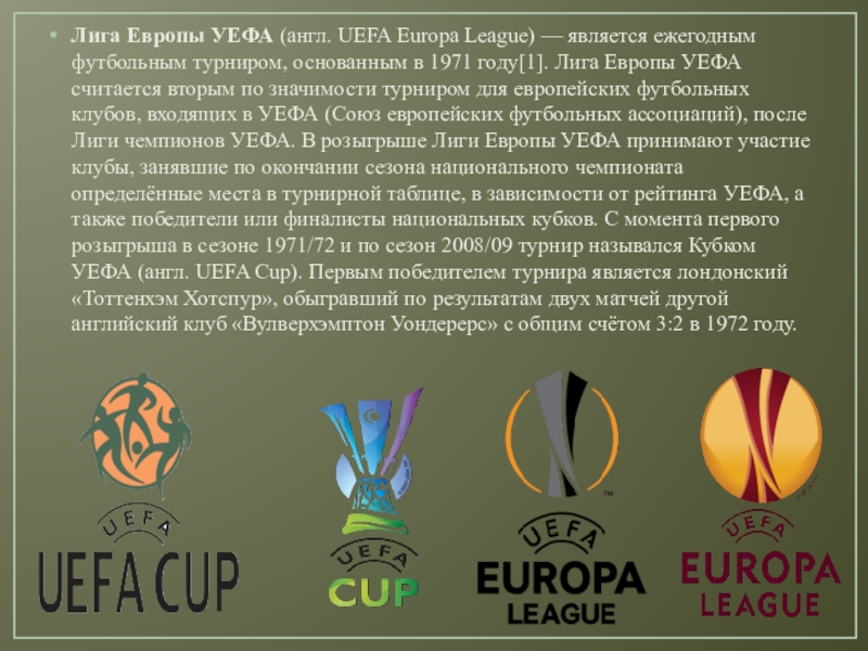 турниром, основанным в 1971 году[1]. Лига Европы УЕФА считается вторым по значимости турниром для европейских футбольных клубов, входящих в УЕФА (Союз европейских футбольных ассоциаций), после Лиги чемпионов УЕФА. В розыгрыше Лиги Европы УЕФА принимают участие клубы, занявшие по окончании сезона национального чемпионата определённые места в турнирной таблице, в зависимости от рейтинга УЕФА, а также победители или финалисты национальных кубков. С момента первого розыгрыша в сезоне 1971/72 и по сезон 2008/09 турнир назывался Кубком УЕФА (англ. UEFA Cup). Первым победителем турнира является лондонский «Тоттенхэм Хотспур», обыгравший по результатам двух матчей другой английский клуб «Вулверхэмптон Уондерерс» с общим счётом 3:2 в 1972 году.