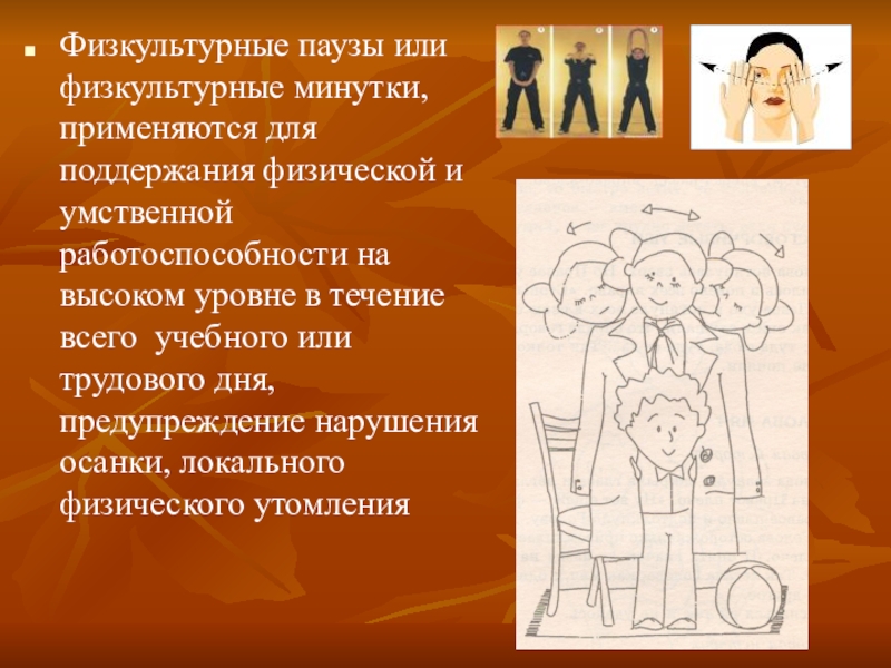 Слайд 9Физкультурные паузы или физкультурные минутки, применяются для поддержания физической и умственной