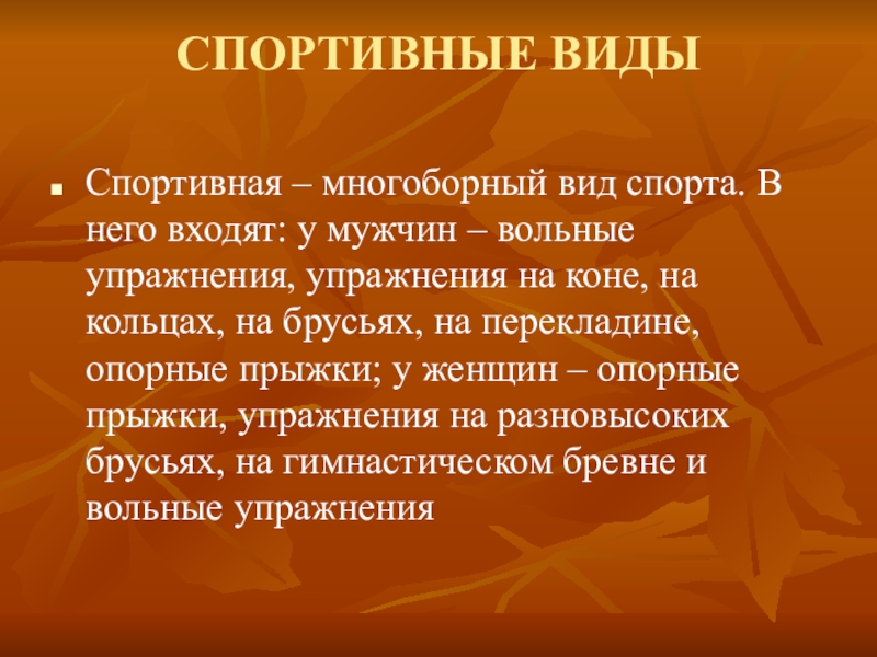 – вольные упражнения, упражнения на коне, на кольцах, на брусьях, на перекладине, опорные прыжки; у женщин – опорные прыжки, упражнения на разновысоких брусьях, на гимнастическом бревне и вольные упражнения