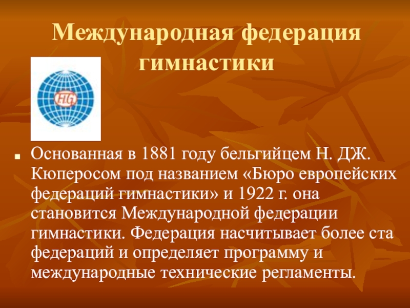 Слайд 5Международная федерация гимнастики