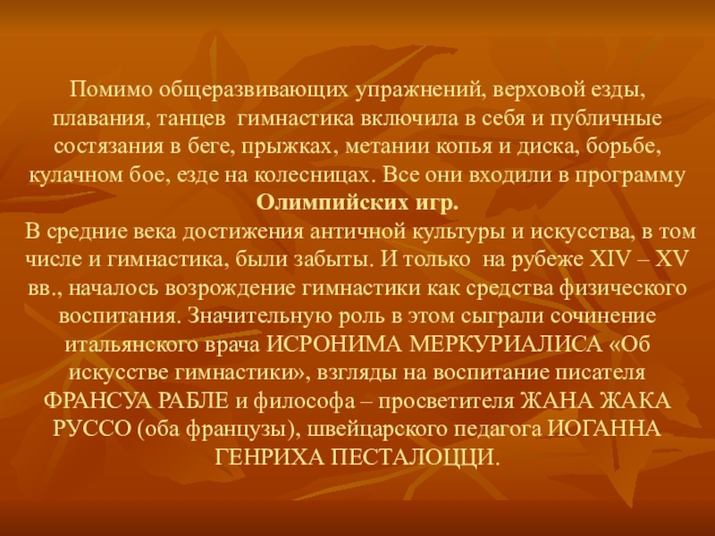 В средние века достижения античной культуры и искусства, в том числе и гимнастика, были забыты. И только на рубеже XIV – XV вв., началось возрождение гимнастики как средства физического воспитания. Значительную роль в этом сыграли сочинение итальянского врача ИСРОНИМА МЕРКУРИАЛИСА «Об искусстве гимнастики», взгляды на воспитание писателя ФРАНСУА РАБЛЕ и философа – просветителя ЖАНА ЖАКА РУССО (оба французы), швейцарского педагога ИОГАННА ГЕНРИХА ПЕСТАЛОЦЦИ.