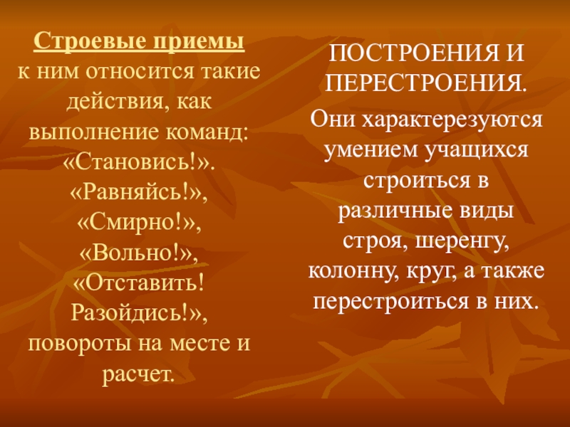 к ним относится такие действия, как выполнение команд: «Становись!». «Равняйсь!»,