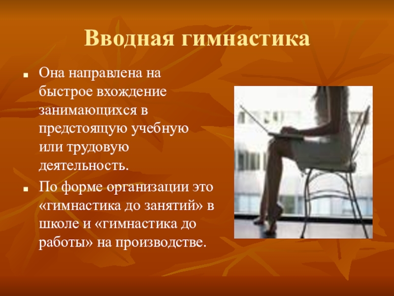 По форме организации это «гимнастика до занятий» в школе и «гимнастика до работы» на производстве.