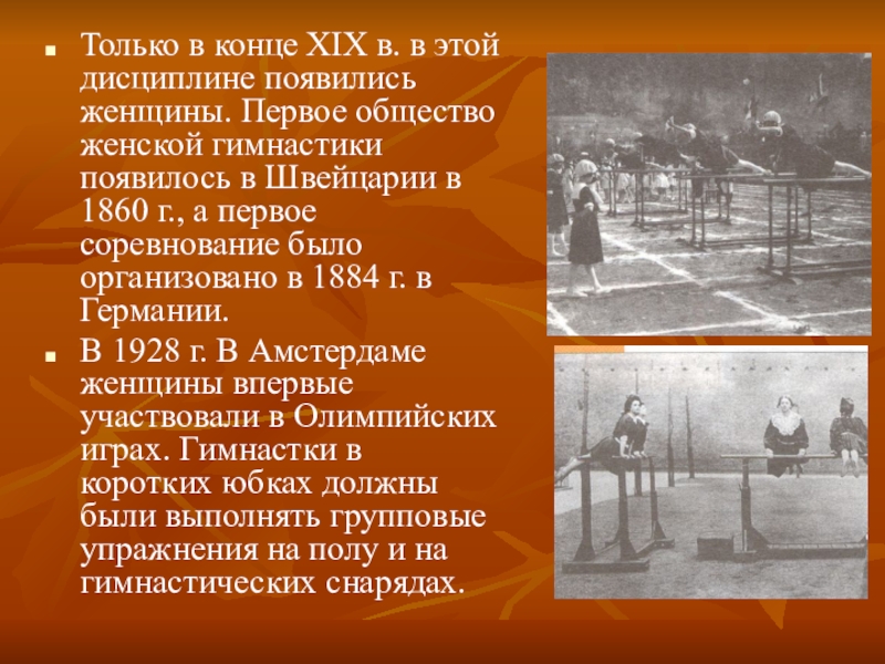 В 1928 г. В Амстердаме женщины впервые участвовали в Олимпийских играх. Гимнастки в коротких юбках должны были выполнять групповые упражнения на полу и на гимнастических снарядах.
