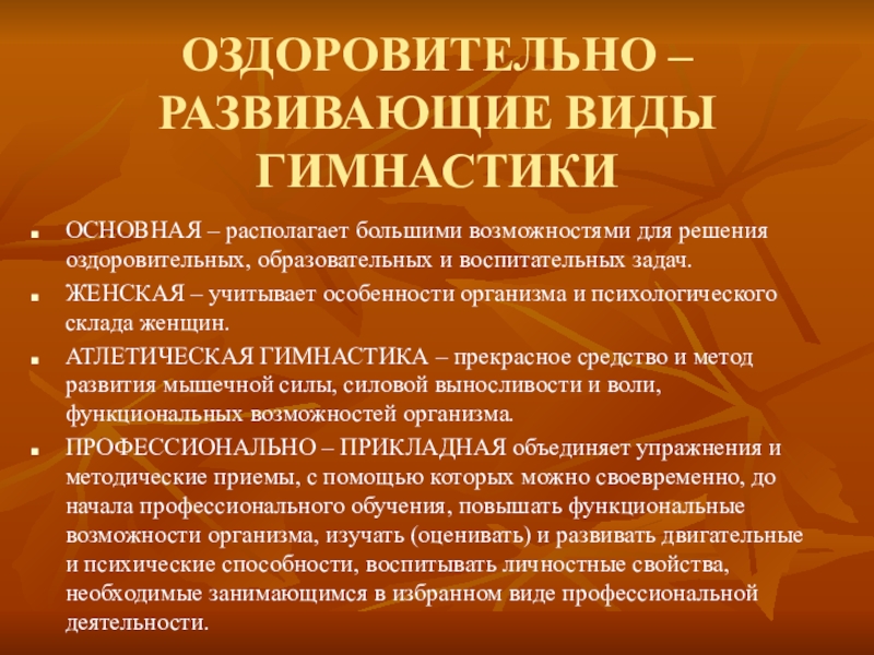 Слайд 12ОЗДОРОВИТЕЛЬНО – РАЗВИВАЮЩИЕ ВИДЫ ГИМНАСТИКИ