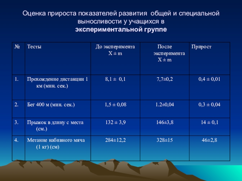 у экспериментальной группы составил: прохождение дистанции 1 км (мин. сек) – 5%; бег 400 м (мин. сек.) – 22,2%; прыжок в длину с места (см) – 10%; метание набивного мяча (1кг) (см) -14,3%.