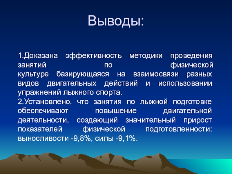 2.Установлено, что занятия по лыжной подготовке обеспечивают повышение двигательной деятельности, создающий значительный прирост показателей физической подготовленности: выносливости -9,8%, силы -9,1%.