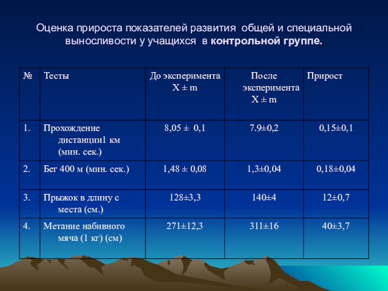 Прирост результатов в конце эксперимента у контрольной группы составил: прохождение дистанции 1 км (мин. сек) – 2,5%; бег 400 м (мин. сек.) – 14,2%; прыжок в длину с места (см) – 8,9%; метание набивного мяча (1кг) (см) -13,7%