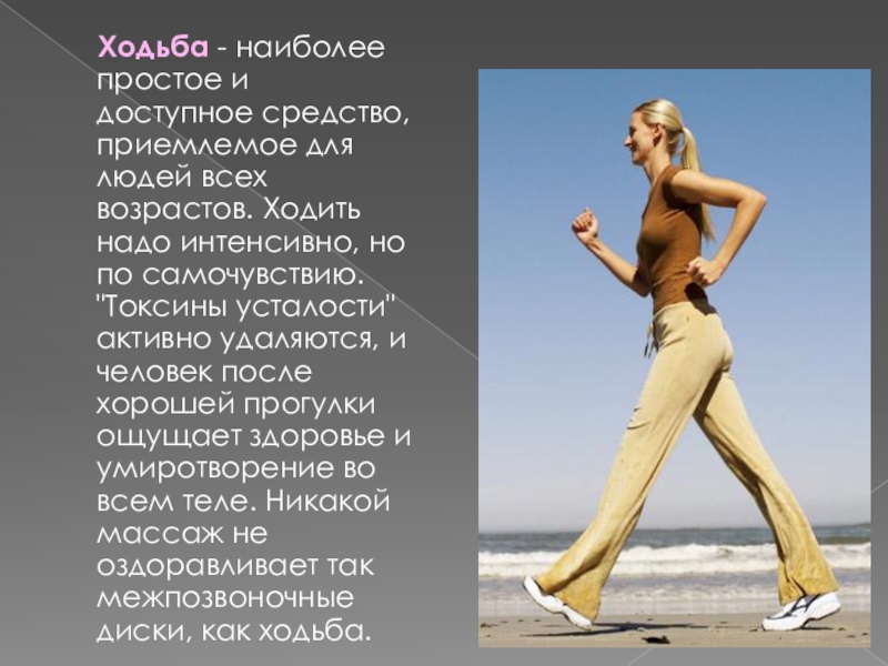 Слайд 8 Ходьба - наиболее простое и доступное средство, приемлемое для людей всех
