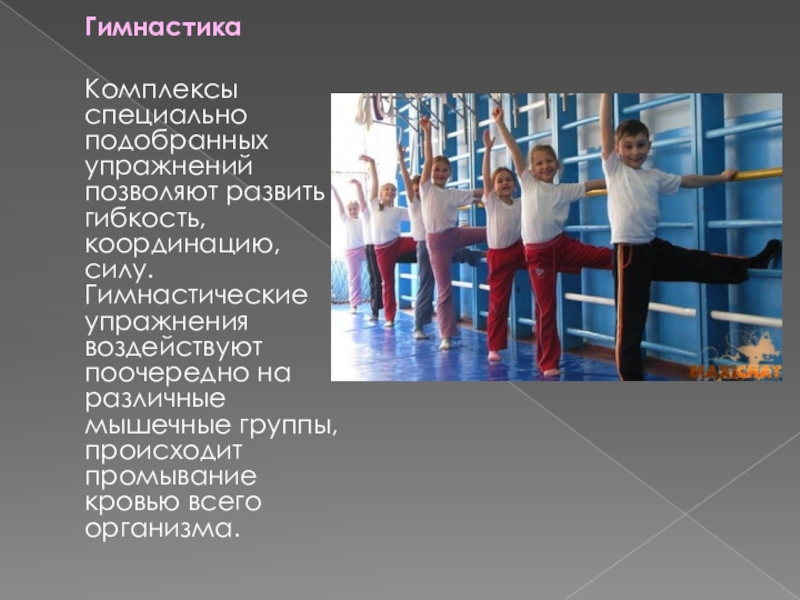 Комплексы специально подобранных упражнений позволяют развить гибкость, координацию, силу. Гимнастические упражнения