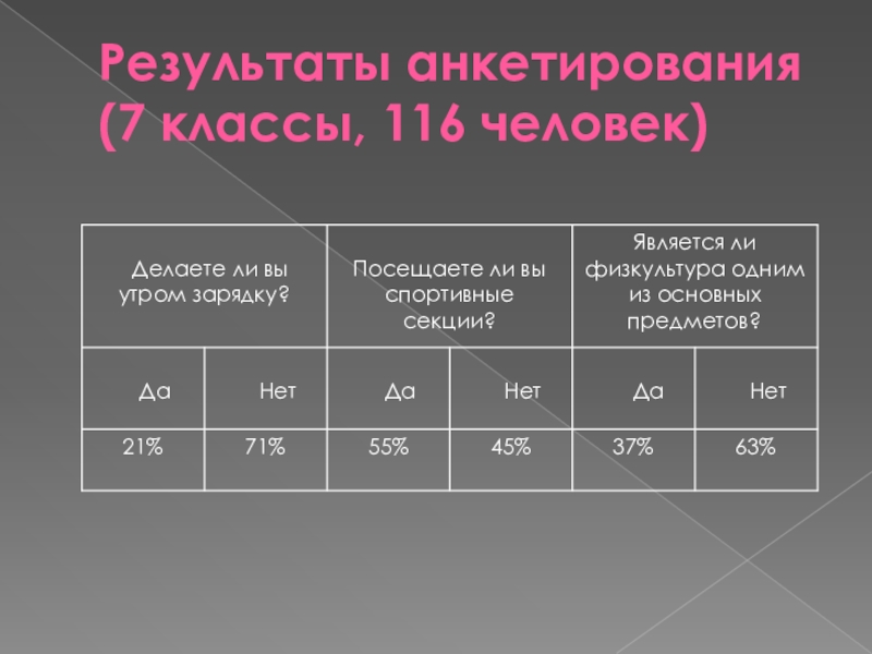 Слайд 5Результаты анкетирования (7 классы, 116 человек)