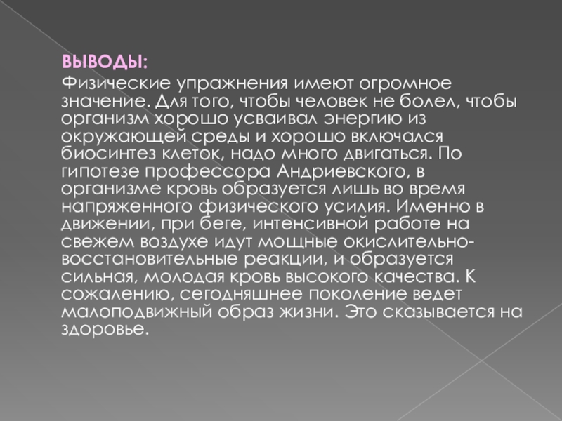 чтобы организм хорошо усваивал энергию из окружающей среды и хорошо включался биосинтез клеток, надо много двигаться. По гипотезе профессора Андриевского, в организме кровь образуется лишь во время напряженного физического усилия. Именно в движении, при беге, интенсивной работе на свежем воздухе идут мощные окислительно-восстановительные реакции, и образуется сильная, молодая кровь высокого качества. К сожалению, сегодняшнее поколение ведет малоподвижный образ жизни. Это сказывается на здоровье.