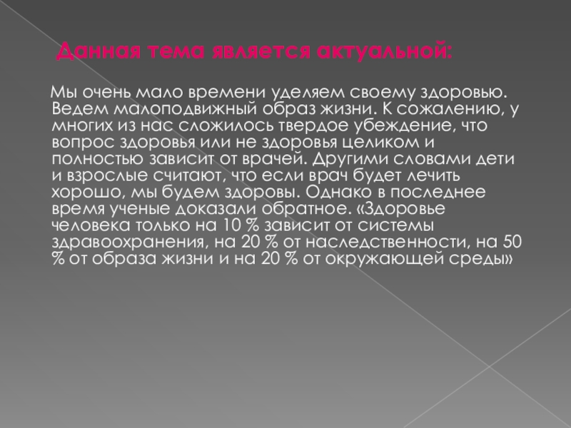 очень мало времени уделяем своему здоровью. Ведем малоподвижный образ жизни. К сожалению, у многих из нас сложилось твердое убеждение, что вопрос здоровья или не здоровья целиком и полностью зависит от врачей. Другими словами дети и взрослые считают, что если врач будет лечить хорошо, мы будем здоровы. Однако в последнее время ученые доказали обратное. «Здоровье человека только на 10 % зависит от системы здравоохранения, на 20 % от наследственности, на 50 % от образа жизни и на 20 % от окружающей среды»