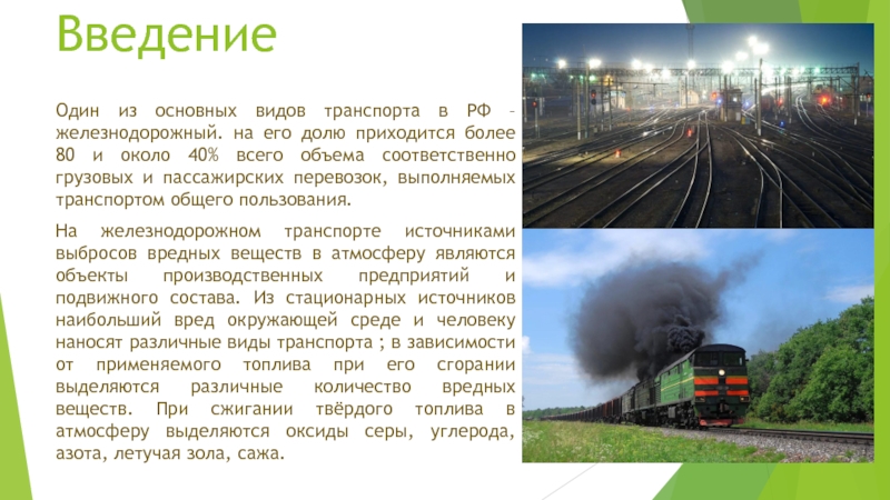 На железнодорожном транспорте источниками выбросов вредных веществ в атмосферу являются объекты производственных предприятий и подвижного состава. Из стационарных источников наибольший вред окружающей среде и человеку наносят различные виды транспорта ; в зависимости от применяемого топлива при его сгорании выделяются различные количество вредных веществ. При сжигании твёрдого топлива в атмосферу выделяются оксиды серы, углерода, азота, летучая зола, сажа.