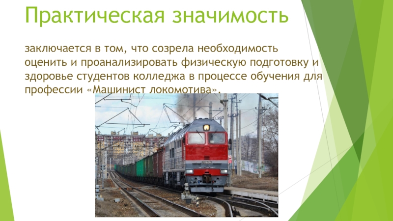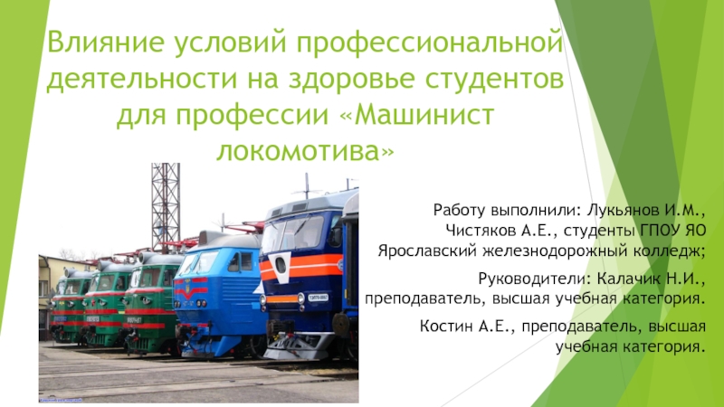 Слайд 1Влияние условий профессиональной деятельности на здоровье студентов для профессии «Машинист локомотива»