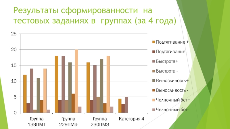 Слайд 28Результаты сформированности на тестовых заданиях в группах (за 4 года)