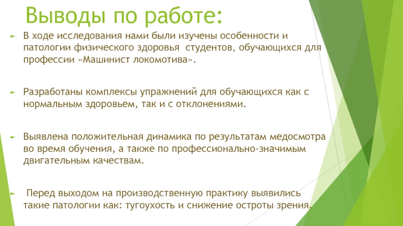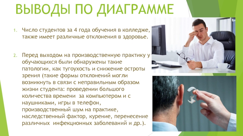 Перед выходом на производственную практику у обучающихся были обнаружены такие патологии, как тугоухость и снижение остроты зрения (такие формы отклонений могли возникнуть в связи с неправильным образом жизни студента: проведении большого количества времени за компьютером и с наушниками, игры в телефон, производственный шум на практике, наследственный фактор, курение, перенесение различных инфекционных заболеваний и др.).