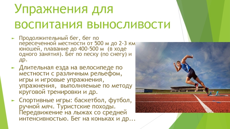 Длительная езда на велосипеде по местности с различным рельефом, игры и игровые упражнения, упражнения, выполняемые по методу круговой тренировки и др.