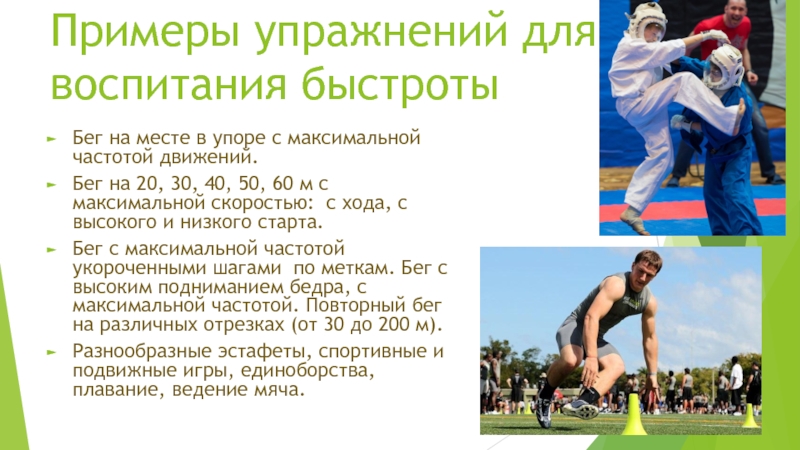 Разнообразные эстафеты, спортивные и подвижные игры, единоборства, плавание, ведение мяча.