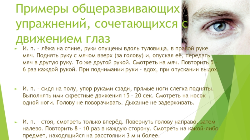 Слайд 21Примеры общеразвивающих упражнений, сочетающихся с движением глаз
