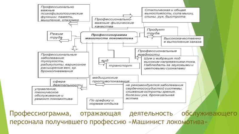 Слайд 12Профессиограмма, отражающая деятельность обслуживающего персонала получившего профессию «Машинист локомотива»