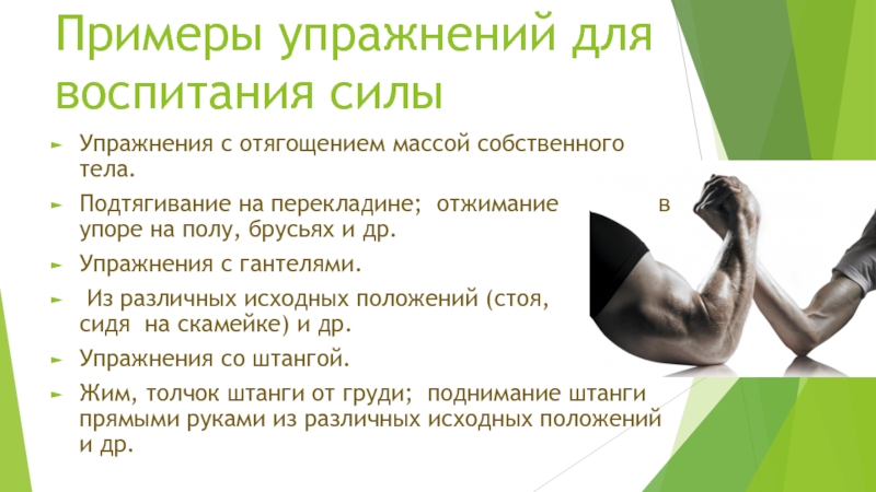 на перекладине; отжимание в упоре на полу, брусьях и др.