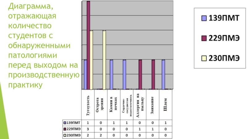 Слайд 16Диаграмма, отражающая количество студентов с обнаруженными патологиями перед выходом на производственную