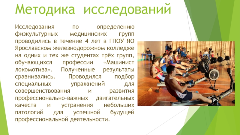 4 лет в ГПОУ ЯО Ярославском железнодорожном колледже на одних и тех же студентах трёх групп, обучающихся профессии «Машинист локомотива». Полученные результаты сравнивались. Проводился подбор специальных упражнений для совершенствования и развития профессионально-важных двигательных качеств и устранения небольших патологий для успешной будущей профессиональной деятельности.