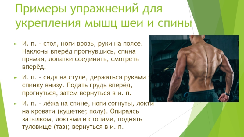 Слайд 23Примеры упражнений для укрепления мышц шеи и спины