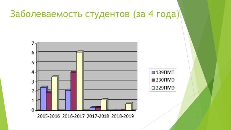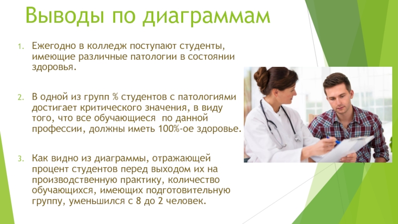 В одной из групп % студентов с патологиями достигает критического значения, в виду того, что все обучающиеся по данной профессии, должны иметь 100%-ое здоровье.