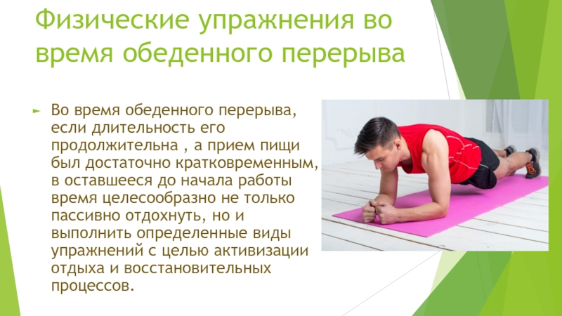 его продолжительна , а прием пищи был достаточно кратковременным, в оставшееся до начала работы время целесообразно не только пассивно отдохнуть, но и выполнить определенные виды упражнений с целью активизации отдыха и восстановительных процессов.