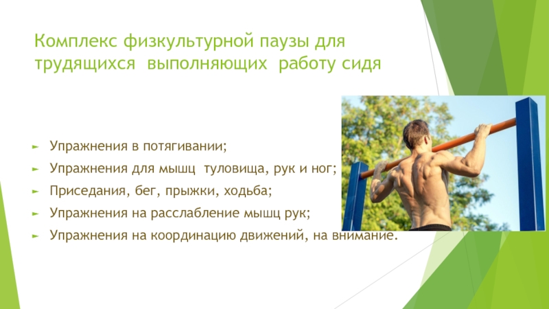 Слайд 19Комплекс физкультурной паузы для трудящихся выполняющих работу сидя