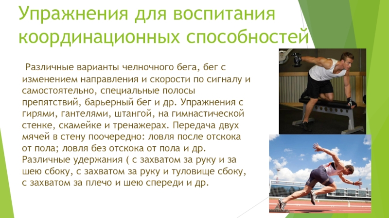 изменением направления и скорости по сигналу и самостоятельно, специальные полосы препятствий, барьерный бег и др. Упражнения с гирями, гантелями, штангой, на гимнастической стенке, скамейке и тренажерах. Передача двух мячей в стену поочередно: ловля после отскока от пола; ловля без отскока от пола и др. Различные удержания ( с захватом за руку и за шею сбоку, с захватом за руку и туловище сбоку, с захватом за плечо и шею спереди и др.