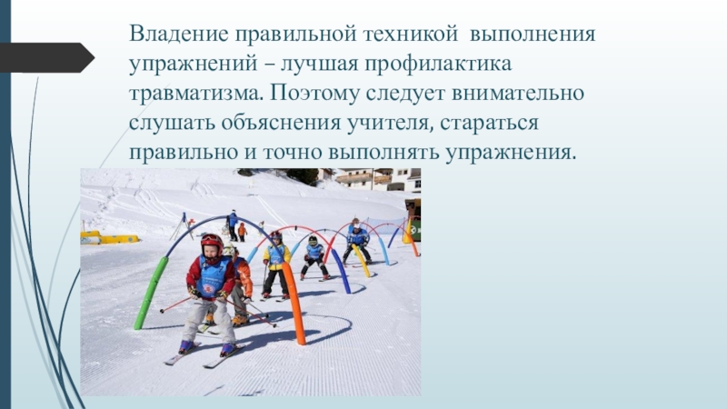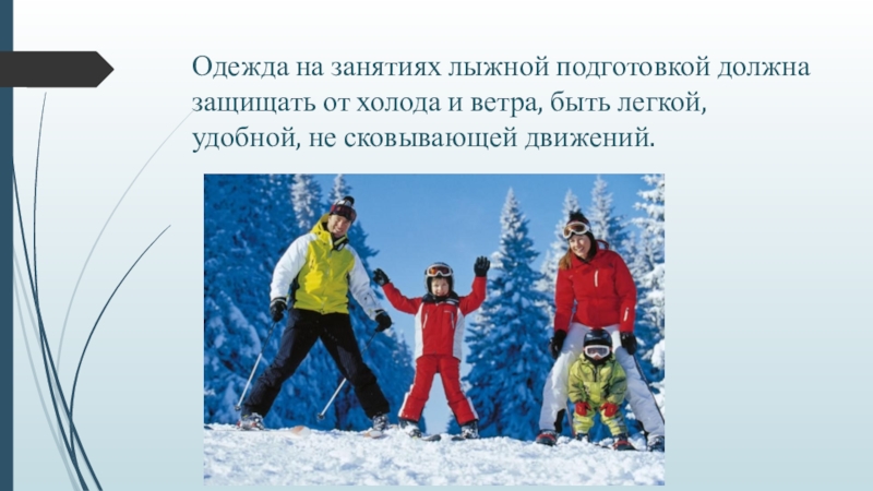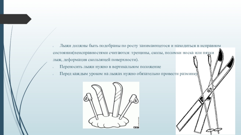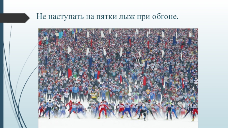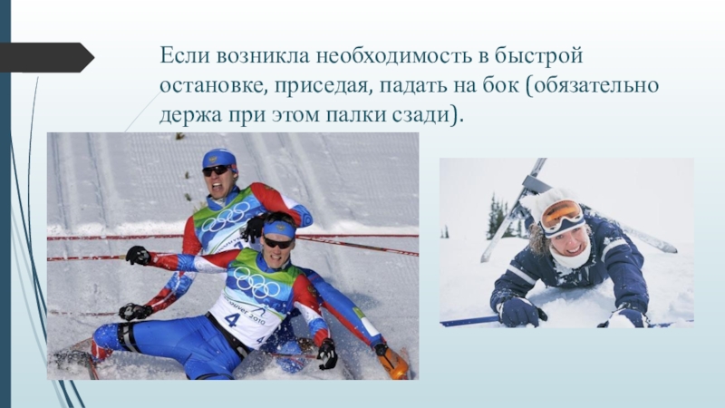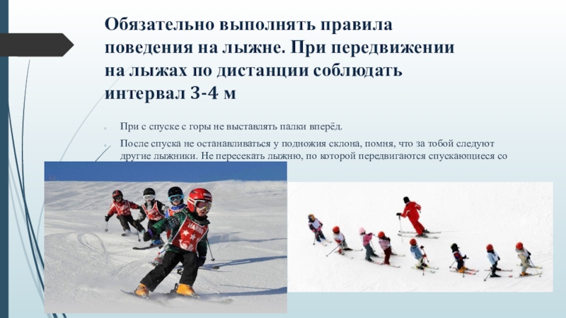 После спуска не останавливаться у подножия склона, помня, что за тобой следуют другие лыжники. Не пересекать лыжню, по которой передвигаются спускающиеся со склона лыжники.